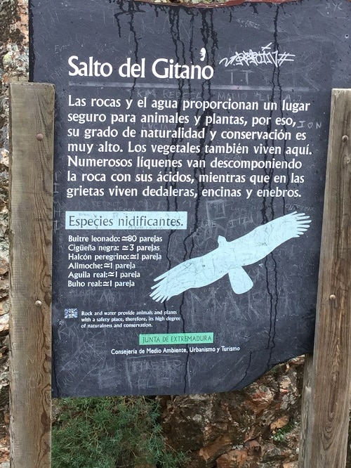 Extremadurasta löytyy monia luonnonsuojelualueita. Meilläkin oli tarkoitus tutustua päiväretken muodossa Monfragüen luonnonpuistoon. Tutustuminen jäi kuitenkin lyhyeksi. Satoi nimittäin kaatamalla koko sen päivän jolloin sillä suunnalla ajoimme. Sen verran kuitenkin autosta pystyimme poistumaan, että hetken ihastelimme Monfragüen kuuluisia alkuperäisasukkaita, korppikotkia. Nämä upeat linnut liitelivät sateesta huolimatta kuuluisan Salto del Gitanon kalliomuodostelman yllä. Laji on nimeltään Gyps Fulvus (hanhikorppikotka) ja Monfragüessa niitä on yli 80 paria.