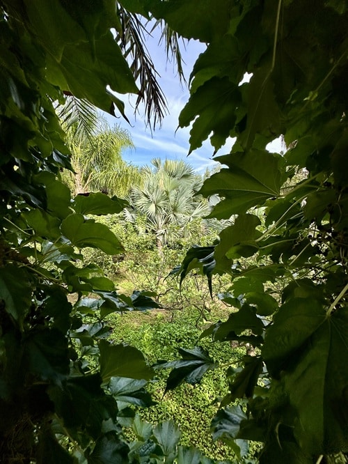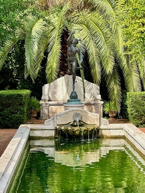 Tässä osassa oli suunnittelussa otettu huomioon sen eri osista avautuvat näkymät. Kun sieltä katsoi kauemmaksi eteenpäin, näki aina kun taulun, jossa jotain mielenkiintoista, huvimajan, patsaan, suihkulähteen tai eri värisiä palmuja kasvamassa ryhminä. Varmasti harkitusti mietittynä yksityiskohtina. Olin kauan suunnitellut ja haaveillut tätä puutarhavierailua. Juuri nämä eri näkymät, eri kasvien sommittelu ja mielenkiintooiset patsaat olivat puutarhan parasta antia. Mukaan lähti monta ideaa omaankin käyttöön.