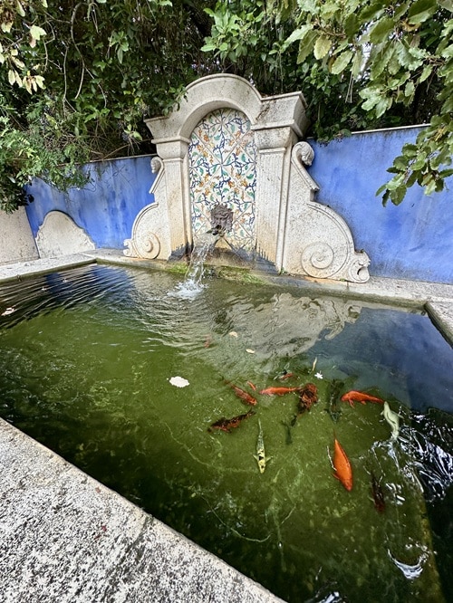 Monessa puutarhan osassa oli myös suihkulähteitä. Niissä ui paljon isoja erivärisiä kaloja. Opas kertoi, että kalat eivät ole vain silmänruokaa vaan niillä on erityinen tehtävä. Ne nimittäin ovat osa puutarhan ekologisesti kestävästä vedenpuhdistusjärjestelmästä. Järjestelmään kuuluu seuraavat osatekijät: