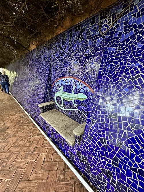 Yksi osa puutarhasta oli selvästi perinteinen valencialainen puutarha arabialaisin vaikuttein. Kuljimme myös upeaa ns. Paseo de Trencadis käytävää pitkin. Se oli käytävä, jonka pitkä seinä oli laatoitettu sinisin mosaikkein. Tuo trencadis nimi tarkoittaa ”rikkinäistä laattamosaiikkia”. Tätä tekotapaa esimerkiksi Antoni Gaudi käytti töissään. Kaakelit, posliinit ja laatat ensin rikotaan ja niistä rikotuista paloista muodostetaan uutta pintaa. Tekotapa on hyvin yleinen mosaiikkitöissä.