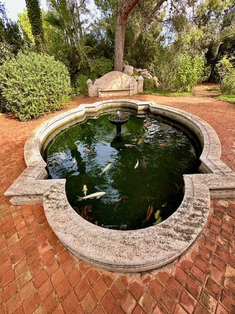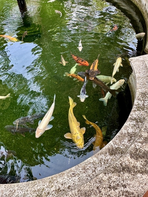 Monessa puutarhan osassa oli myös suihkulähteitä. Niissä ui paljon isoja erivärisiä kaloja. Opas kertoi, että kalat eivät ole vain silmänruokaa vaan niillä on erityinen tehtävä. Ne nimittäin ovat osa puutarhan ekologisesti kestävästä vedenpuhdistusjärjestelmästä. Järjestelmään kuuluu seuraavat osatekijät: