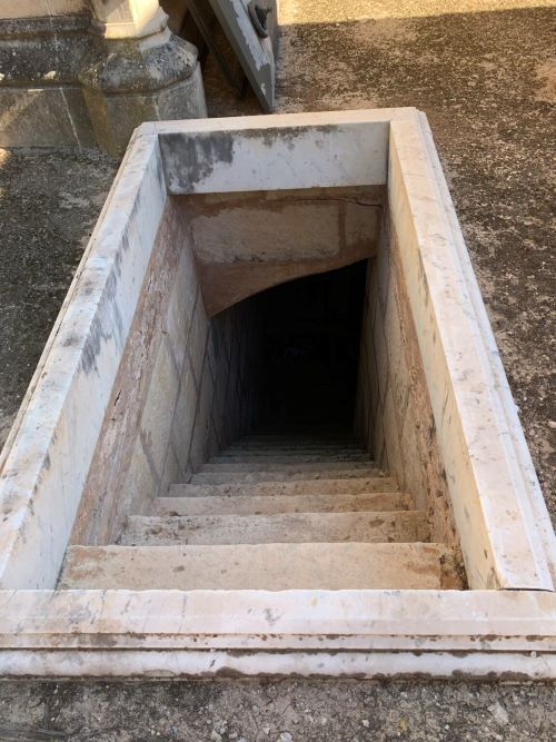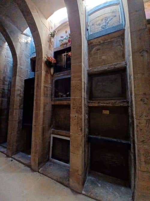 Käytävien kummallakin puolella seinissä oli monessa kerroksessa haudat muistolaattoineen. Suurin osa hautapaikoista on sinne vanhalta hautausmaalta siirrettyjen vainajien hautoja mutta ihan tyhjiä, vielä käyttämättömiäkin oli. Monissa oli tuotu kukkia laatan eteen, eli ihan nykyisessäkin käytössä siis ovat nämä käytävät