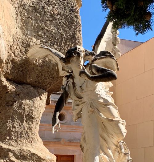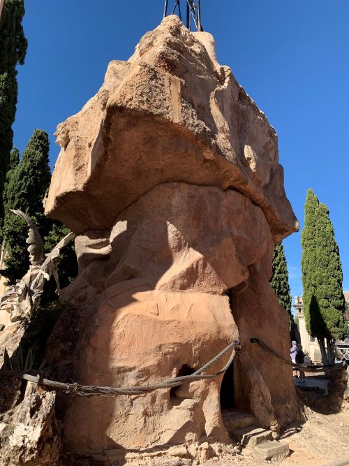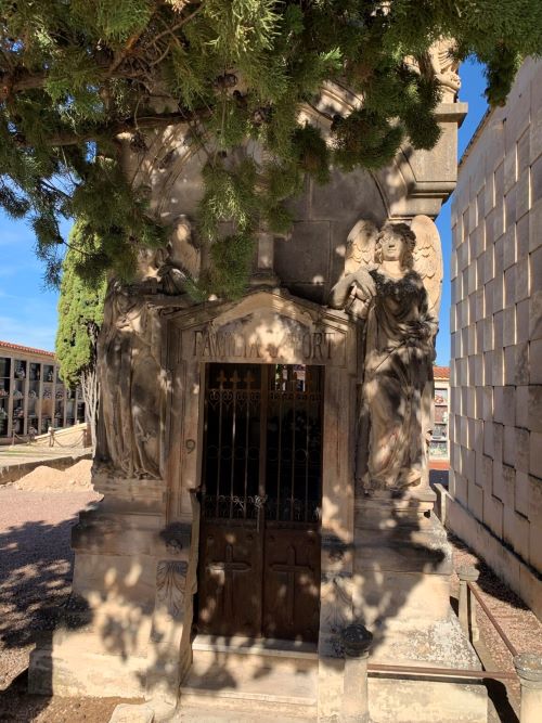 Kun astut sisään hautausmaalle huomaat heti ”Hiljaisuuden Enkeli” patsaan, jonka on tehnyt kuvanveistäjä Lorenzo Ridaura. Modernistiseen tyyliin veistetty herkkä enkeli, joka seisoo ison kivimöhkäleen vieressä. Tämä iso möhkäle on ns. troglodyyttipanteoni. Ja se on Agustín Gisbertin perheen hautamuistomerkki ja hautaholvi. Tämä perhehän tunnettiin myös Casa del Pavon omistajista. Troglodyytti taas tarkoittaa luolamiestä. Nämä ovat juuri niitä mielenkiintoisia yksityiskohtia, joiden takia pidän tämänkin blogin kirjoituksesta. Asioista kun ottaa selvää näkemänsä lisäksi oppii paljon uutta.