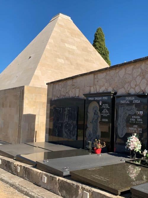 Tämä ainutlaatuinen muuri/Hypogea, jossa sisäänrakennetut eri perheiden panteonit. Näiden suunnitteluun Timoteo Briet haki inspiraatiota Barcelon Montjuïc hautausmaalta. Ja tämä arkkitehtihan oli tuttu niistä usein vihreiden julkisivulaattojen modernistisista taloista joita hän suunnitteli Alcoyn kaupunkiin. Näin kohtasimme kaupungissa edellisenä päivänä näkemämne arkkitehdin uudelleen. Kuten monet muutkin edellisen päivän taiteilijat.