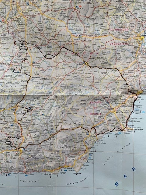 Reitti oli: Torrevieja - Baza - Montefrio - Baeza - Ubeda - Almagro - Puerta Lapice - Consuegra ja sieltä Tomalloson kautta takaisin Torreviejaan.