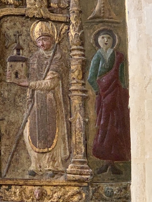 Kirkon kaunis saarnastuoli 1400-luvulta. Alunperin puusta tehty, mutta myöhemmin päällystetty pellillä maalattuine kuvineen. Huomiotani herätti yksi noista peltisistä kohokuvista. Restaurointityön aikana lisätty, muu ei selitä tuota täysin erilaista ulkonäköä