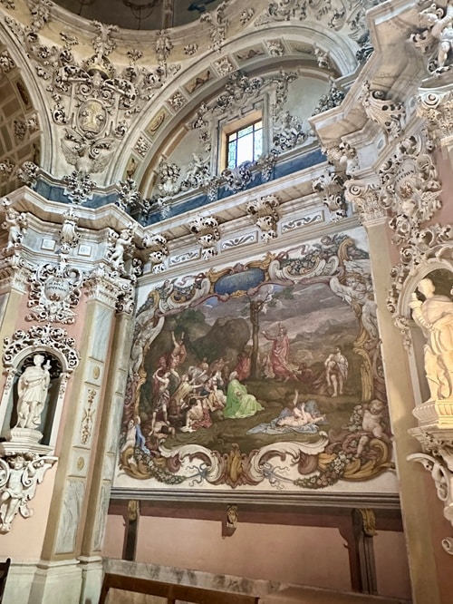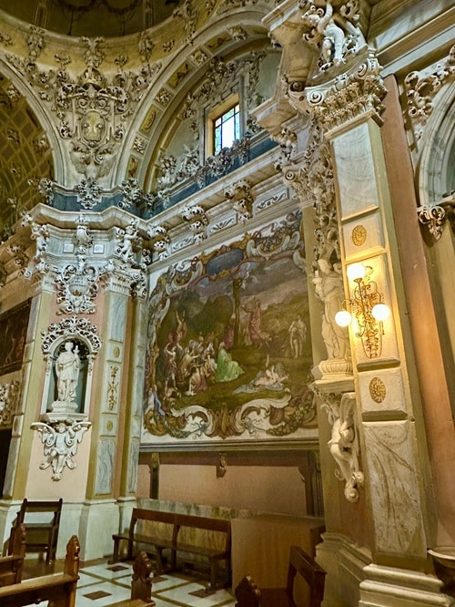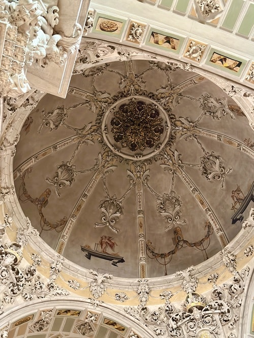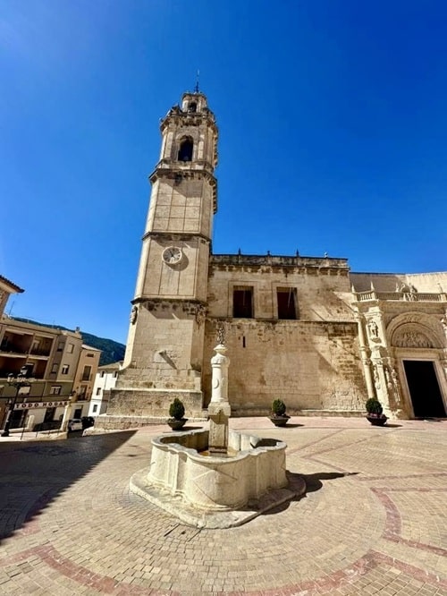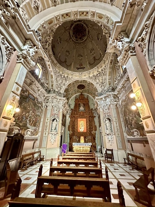 Kirkko la Iglesia de la Asunción osoittautuikin tosi upeaksi kohteeksi. Kiertelimme ensin ihan pimeässä kirkkosalissa kunnes löysimme oven jota etsimme. Petyimme ensin kun emme sitä saaneet auki, olinhan ottanut etukäteen selvää, että kappeli olisi näkemisen arvoinen. Onneksi aikamme yritettyämme, ovi kuitenkin aukesi ja astuimme sisään Capilla de la Comunión/ehtoolliskappeliin. Valot syttyivät kappelissa ja sen muusta kirkosta täysin poikkeava sisustus tuli näkyviin. Kaunis churrigueresque tyylinen kappeli monine taideteoksineen oli maineensa veroinen ja ehdottomasti näkemisen arvoinen. Itse kirkko on gotiikka ja oppaissa mainitaan sen julkisivun sisäänkäynti hienona esimerkkinä valencialaisesta renesanssityylistä. Kirkko on vuodelta 1400-luvulta, kuuluisa sisäänkäynti 1500-luvulta, ehtoolliskappeli 1600-luvulta ja torni 1700.