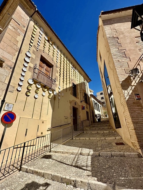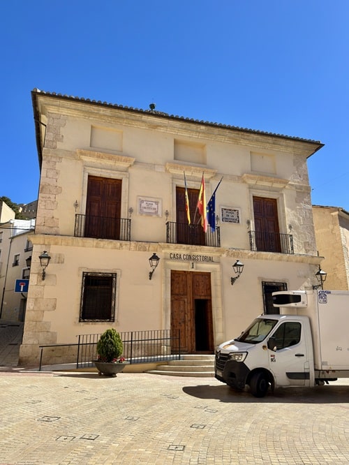 Kaupungintalo samalla aukiolla. Nykyaikainen uusklassinen rakennus, jonka suunnitteli arkkitehti Vicente Gascó i Massot vuonna 1793 ja joka rakennettiin 1800-luvun alkuvuosikymmeninä. Tämän talon yksi seinä oli kauniisti koristeltu lukuisilla lautasilla. Se kertoi meille Biarin vanhasta keramiikkaperinteestä. Kaupunki on kuuluisa varsinkin sinisistä koristeluista keramiikassa. Tämän ”lautasseinät” yhdestä ovesta pääsee sisään turisti-infoon. Sieltä saimme hyvän vinkin lounaspaikaksi ja kehoituksen käydä saman aukion yhdessä talossa olevaan Etnologiseen museoon.