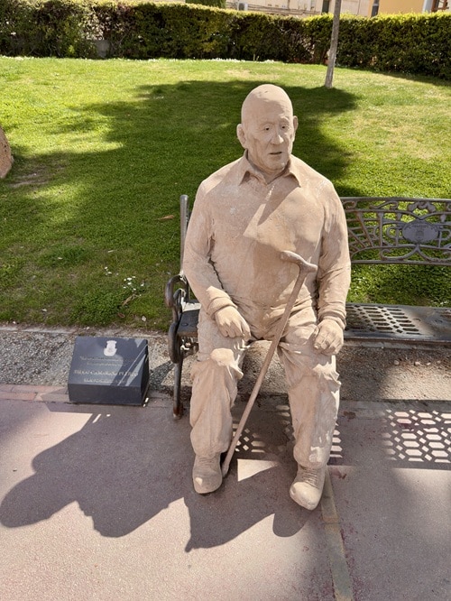 Jonkun puiston laidalla meitä tervehti tälläinen patsas. Aika kummallinen ja kotona sitten surffasin netissä löytääkseni kuka tämä merkkihenkilö oikein oli kun patsaan muodossa nyt siellä istuu. Kyse on kaupungissa eläneestä kaikkien kunnioittamasta asukkaasta nimeltä Diego Camarasa Puerto, jonka lempinimi oli”Dieguito”. Ei selvinnyt mitä hän elääkseen teki, mutta kovasti kehuttiin ystävälliseksi ja kaikkien rakastamaksi kaupunkilaiseksi. Hän kuoli 74 vuotiaana vuonna 2018. Mitähän Dieguito itse olisi mieltä tästä hyperrealistisesta veistoksesta.