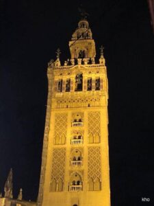 Reina de las torres del mundo, la Giralda, Sevillan katedraalin kellotorni, Sevillan maamerkki. Kaikkien tornien kuningas) Rakennettu vuosina 1184-96 viereisen moskeijan minareetiksi ja vartiotorniksi Almohad