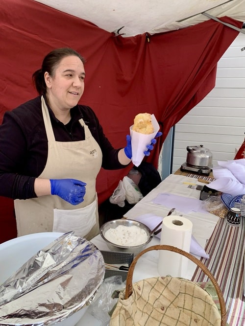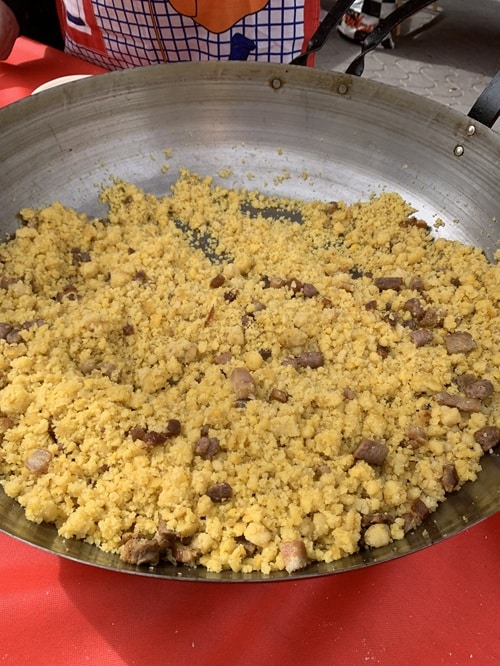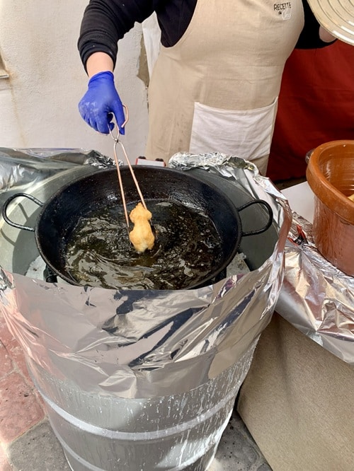 Meidän käyntikerralla teemana oli ruoka. Me maistelimme esimerkiksi paikallisia ”munkkeja” nimeltä tortas fritas, joka kääntyy ”paistettu kakku” mutta maistuu munkeilta😜 ja kotiinkin ostettiin paikallista pullaa. Ostin myös pari Chicharrones– leivonnaista. Google kääntää sanan ”rasvajäämäksi” mutta oikea sana ehkä porsaan ihra. Tämä sokeripäällysteiset ”leipäset” olivat herkullisen näköisiä ja siksi ostin. Kotimatkalla nämä herkkupalat muuttuivat korpuksi ja syödessä ihmettelin mitä kovaa ja sitkeää jää pyörimään suuhun ja hampaan väliin. Googlasin reseptejä ja tosiaan tarta de chicharrones murcianas reseptissä on possun ihran palasia, jotka sinne sekaan sokerin ja mantelin kanssa leivotaan. Olisin myös maistanut torilla isossa astiassa kokin paistamaa paikallista herkkua nimeltä ”las migas” vaan oli monen metrin jono niin en jäänyt jonottelemaan. Aineet on possun rasvaset lihanpalat ja oliiviöljyssä pyöritelty vehnäjauhokikkare.