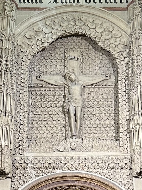 Kuvistani näkee tuon koristeiden moninaisuuden. Sieltä erottuu nuo lukuisat vaakunat, reliefejä, hirviön kuvia, lohikäärmeitä, kukka-asetelmia, köynnöksiä, Kristuksen patsas keskellä, pitkä kirjoitus ympäri kappelia ja taulu. Löydän joka kerta jotain uutta tuosta seinästä. Se on ikäänkuin yksi taideteos monine yksityiskohtineen. Harmi vaan kun sisään kappeliin ei pääse vaan sitä on tiirailtava ja kuvattava rautakaltereiden välistä.