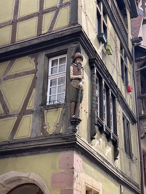 Rakennuksesta kannattaa huomata nuo 106 ihmispääveistosta ja sen harjakaton ylimmäinen pieni patsas. Patsas esittää viinitynnyrintekijää ja sen on tehnyt Colmarissa syntynyt kuvanveistäjä Auguste Barthold. Tämä taiteilija on myös luonut New Yorkin vapaudenpatsaan. Huomaatko myös, että ikkunat ovat eri levyisiä ja epäsäännöllisesti pystysuunnassa sijoitettuja. Muitakin hienoja veistoksia noiden erilaisten päiden lisäksi talon julkisivusta löytyy. Ja mielenkiintoiset lasi-ikkunat sekä kaunis sisäpatio.