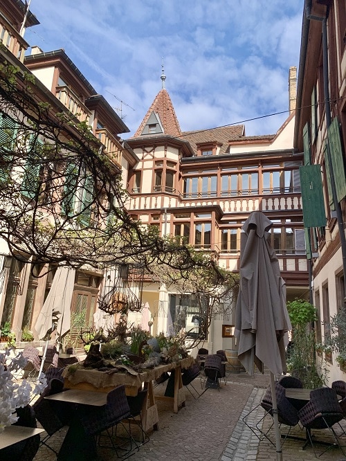 Levähdettiin hetken aikaa tämän talon alakerran kahvilassa Grand Rue -kadulla. Oppaan mukaan ”saksalaisen renessanssin ihme”