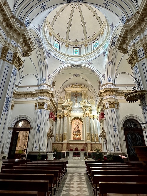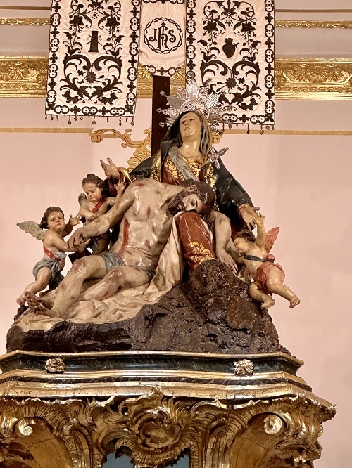 Kirkon pääalttarin takana on Virgen de Doloreksen iso patsas. Sen on tehnyt arvostettu murcialainen kuvanveistäjä Francisco Salzillo vuosina 1743–1745.  Se kuvaa Mariaa miekka rinnassaan. Tämä miekka on tyypillistä näissä tämän neitsyen patsaissa. Jaloissaan Marialla on ristiltä pois nostettu Jeesus.