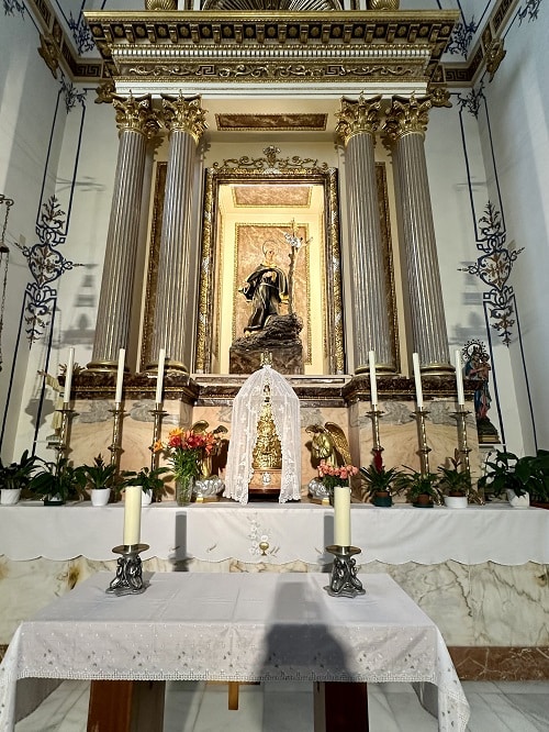 Kirkon yhdessä isossa kappelissa on tämä patsas ja hieno kultainen astia, lienee nimeltään monstrance. Nämä upeat astiat liittynevät ehtoolliseen. Patsas esittää San Pascual Bailónia. Hän oli lukutaidoton paimen, josta tuli munkki, myöhemmin paavi julisti hänet autuaaksi ja toinen paavi kanonisoi hänet, eli teki hänestä pyhän miehen. Hän halusi pysyä munkkina ja hänen kerrotaan sanoneen kun hänelle ehdotettiin muita tehtäviä, että ”Synnyin köyhänä ja olen päättänyt kuolla köyhyyteen ja katumukseen”. Hän oli vaatimaton, kulki aina paljain jaloin, antoi vähästään ja jakoi ruoka-annoksensa köyhien kanssa. Hän oppi lukemaan lampaita paimentaessaan vain yhden kirjan avulla ja se kirja oli raamattu. Hän näki paljon näkyjä. Hänet kuvataan näissä kirkoissa olevissakin patsaissa usein munkin asuun, toinen käsi rinnalla ja polvillaan. Häntä pidetään naisten miespuolisena suojelijana, pastorien, kokkien ja kaikkien eukarististen yhdistysten ja veljeskuntien suojeluspyhimyksenä. Tähän pyhimykseen törmää monissa tämän alueen kirkoissa, onhan hän elänyt täällä päin. Patsas on kuvanveistäjä Roque Lópezin työ.