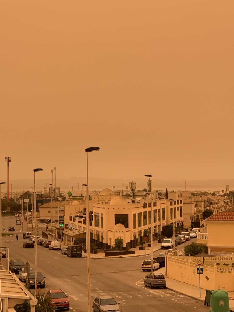 Sateen, tuulen ja kylmyyden lisäksi maaliskuussa kärsittiin poikkeuksellisen runsaista ja pitkäkestoisista ”mutasateista”. Eli tänne kantautuneesta Saharan pölystä, jota aina silloin tällöin tuulten mukana Torreviejaan kantautuu. Nyt saatiin kokea sitten oikein todella voimakas hiekkamyrsky, monen päivän aikana ilma oli niin täynnä tätä hengityksrlle vaarallista pölyä, joka laskeutuu kaikille pinnoille ja tarttuu niihin tiukasti kiinni. Ulkona ollessa silmiä kirvelee ja astmaatikoilla hengitys vaikeutuu.