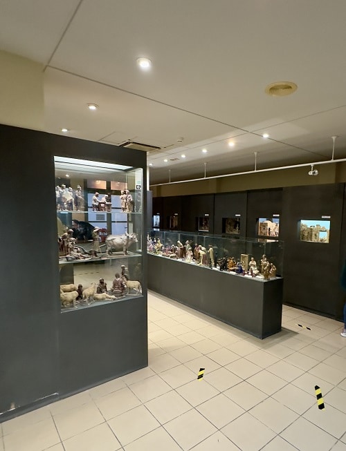 Museo oli täynnä erilaisia seimiasetelmia. Oli pöydällä pidettäviä ja seinällä olevia tauluja. Lasivitriineissä on erilaisia hahmoja.