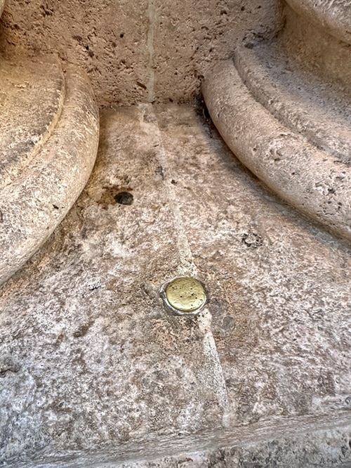 Todellisuudessa nuppi ei ole kultaa vaan se on valmistettu valuraudasta ja siinä on pronssinen pää. Se on vaaitusnaula, tarkemmin ns. NAP-naula, jossa NAP tarkoittaa ”nivelación de alta precisión”.” (korkean tarkkuuden vaaitus). Tämä naula on peräisin 1900-luvun puolivälistä, noin vuodelta 1930. Se on muurannut noiden Calle Mayorin pylväiden väliin ihan tavallinen muurari National Geographic Institut/NGI kansallisen vaaitusverkon merkiksi.