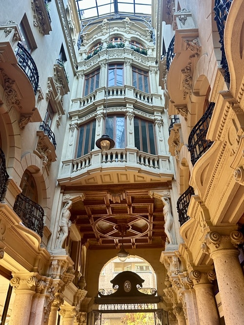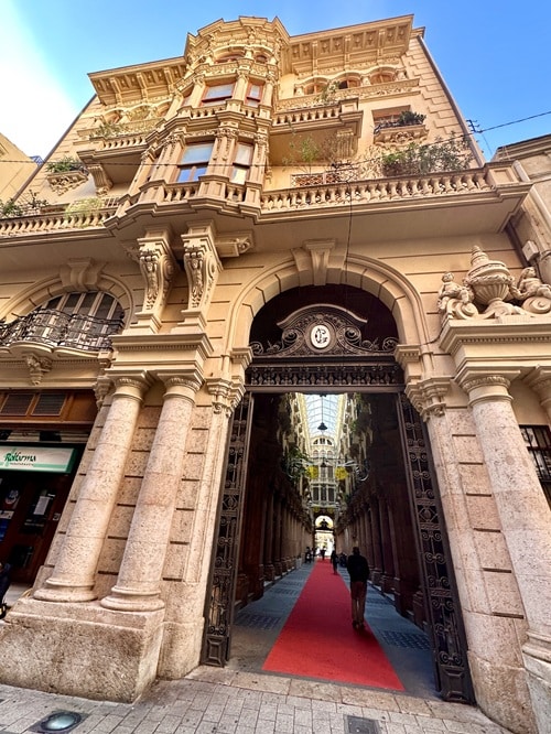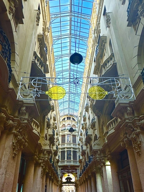 Varsinkin kummankin päädyn porttien yläpuoliset osat ovat todella kauniit kun lasikatolta tuleva valo saa ne kunnolla näkyviin. Muuten käytävä on melko pimeä.