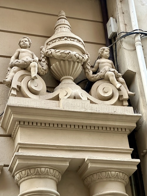 Kummankin portin pylväiden ja pilastereiden päällä on upeat koristeveistokset. Maljakot joita pitkin kiemurtelee seppeleet ja maljakon reunoilla voluuteilla ratsastavia kerubeja.