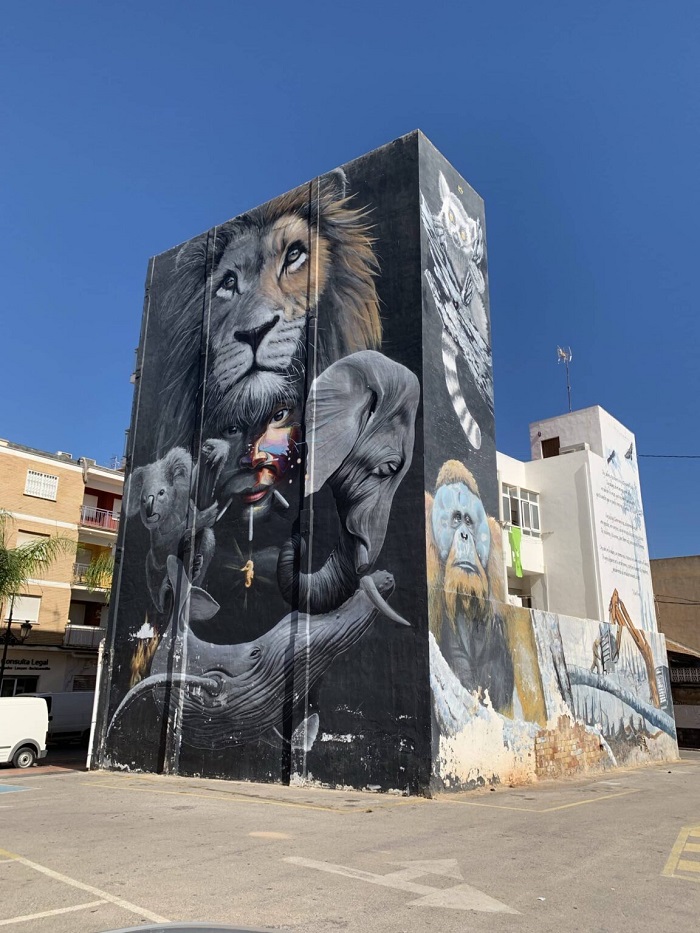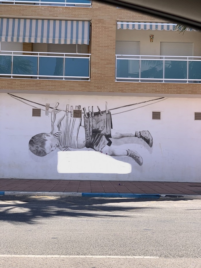 Dale Grimshaw englantilainen taidemaalari ja yksi maailman lahjakkaimmista katutaileilijoista. Kerrotaan, että hän löysi ratkaisun ilmaista itseään taiteella väkivaltaisen lapsuuden jälkeen. Hänen työnsä ovat ”realistisia ja poliittisia, mutta samalla tunteellisia ja vilpittömiä”. Grimshaw on omistautunut Indonesian miehittämän Länsi-Papuan asialle ja se näkyy tässäkin alla kuvaamassani hienossa taideteoksessa. Hänellä on ollut esityksiä Lontoossa, Berliinissä, Roomassa, Pariisissa ja New Yorkissa ja tämä hieno yksi löytyy siis 35 km päässä Torreviejasta.