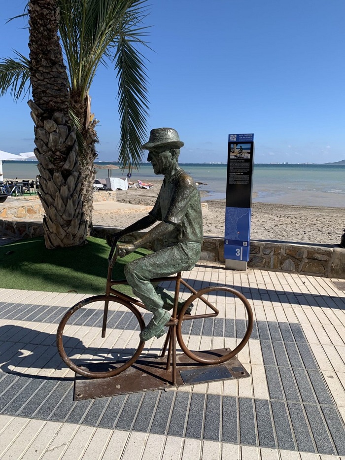 Rantabulevardilla kohtasimme kaupungin kuuluisan pyöräilijän, Sazan, oikealta nimeltään José Sazatornil. Vuonna 2015 kuollut kuuluisa näyttelijä, joka teki pitkän ja palkitun uran teatterissa, elokuvanäyttelijänä ja televisioesiintyjänä. Hän oli vakituinen vieras rantakaupungissa ja tuttu kaupunkilaisille pyöräillessään bulevardilla ja istuessaan kylpylähotellin terassilla. Tämä pyöräpatsas löytyy siis rantapaseolta.