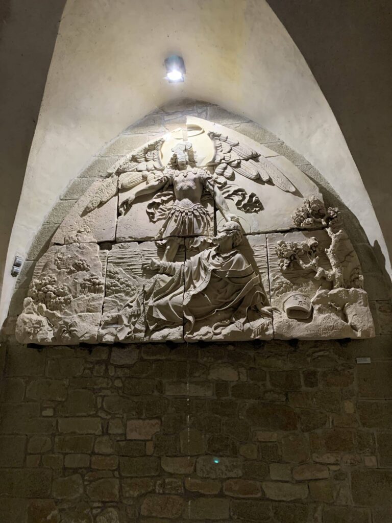 Ruokasalista laskeuduimme alas portaita pitkin seuraavalle tasolle. Alhaalta päin laskettuna toiseen kerrokseen. Portaiden alapäässä seinällä on se suurikokoinen relieffi, jossa arkkienkeli Mikael painaa sormellaan reiän kovapäisen piispa Aubertin kalloon.