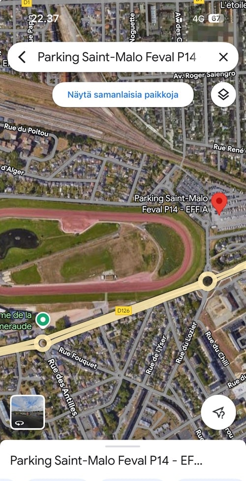 Laitan tähän vielä muistiin kuvan parkkipaikasta, jota Dinanin matkailuneuvonnan rouva meille suositteli. Olikin hyvä. Muutaman kilometrin päässä vanhasta kaupungista, mutta parkkipaikan maksulla pääsi myös sieltä 15 minuutin välein lähtevään bussiin, joka kuljetti suoraan intra-muron portille.