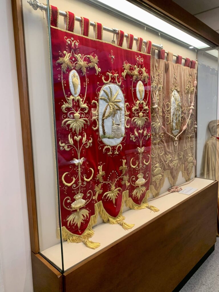 Pasojen lisäksi seinien vitriineissä on esillä kirjottuja kuvakudoksia, kultasepän töitä ja uskonnollisia maalauksia. Todella mielenkiintoisia olivat seinille kehystetyt jokaisen vuoden pääsiäisviikon julisteet. Niitä katsoessa voi huomata miten tuo osa taidetta on vuosien varrella muuttunut. Omankin syntymävuoden juliste sieltä löytyi.