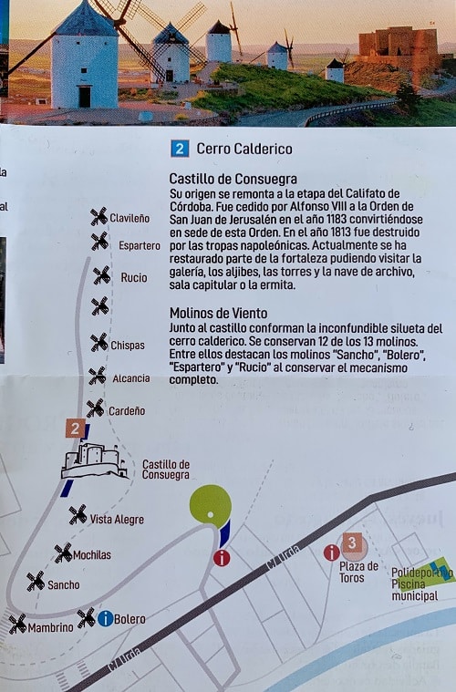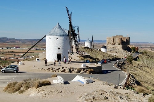 Tällä kukkulalla voi nähdä 12 kauniisti entisöityä myllyä. Myllyt olivat elintärkeitä tälle alueelle, sillä se oli viljantuotantoaluetta aikanaan. Vehnä ja muut viljat piti saada jauhoiksi. Nimi La Mancha tulee arabiasta ja tarkoitaa samaa kun kuiva maa. Eli jokia ei ole, mutta on mäkiä ja suuria avaria peltoaukeamia. Otollisia olosuhteita ja alueita tuulen kerätä voimaa jota voi kerätä energiaksi.
